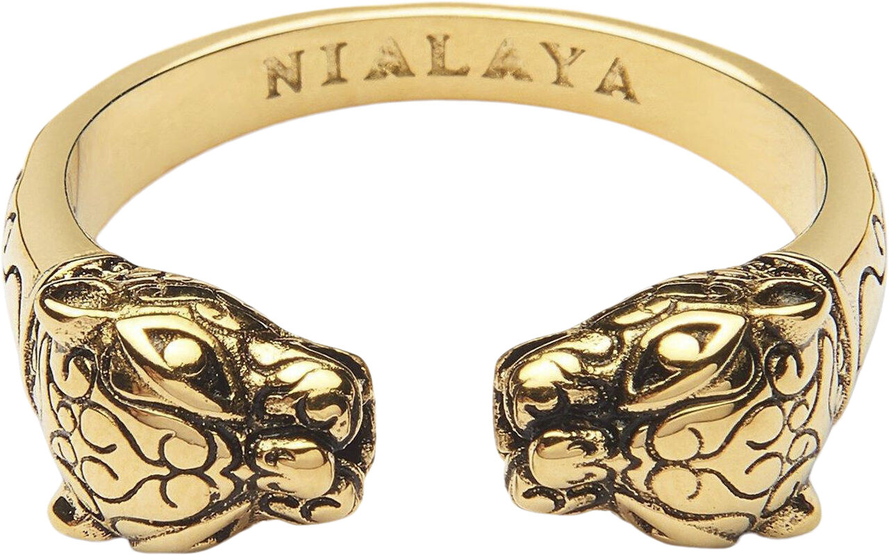 To panterhoveder der stirrer på hinanden fra hver sin side af en åben ring. Det er det samme motiv som i sølv-versionen, men i guld får den et helt andet udtryk. Varmere, tungere, mere selvsikkert.