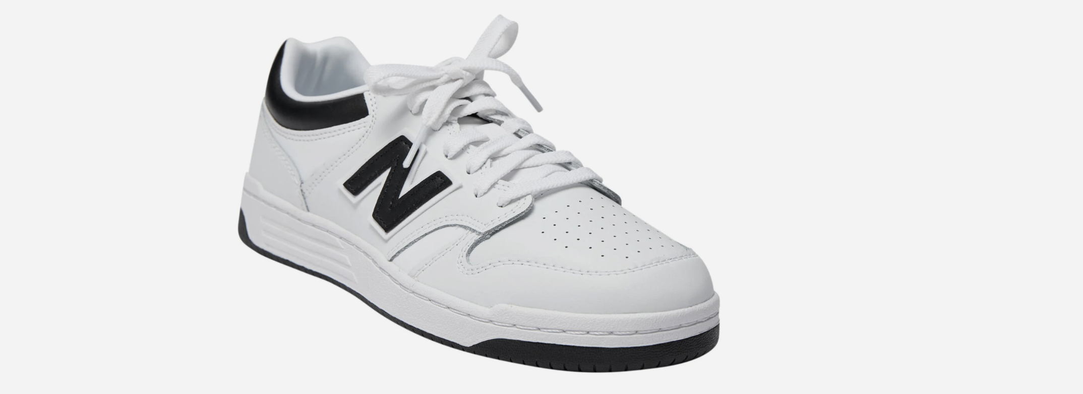 Ved første øjekast er de klassiske: hvid læderoverdel, lav silhuet, ren sål. Men så rammer kontrasterne. Den sorte hæl, det markante “N” i siden og den mørke ydersål giver skoen tyngde og sørger for, at den aldrig bliver flad eller ligegyldig. Det er den type detaljer, der gør forskellen mellem “bare hvide sneakers” og et par, man faktisk vælger igen og igen.